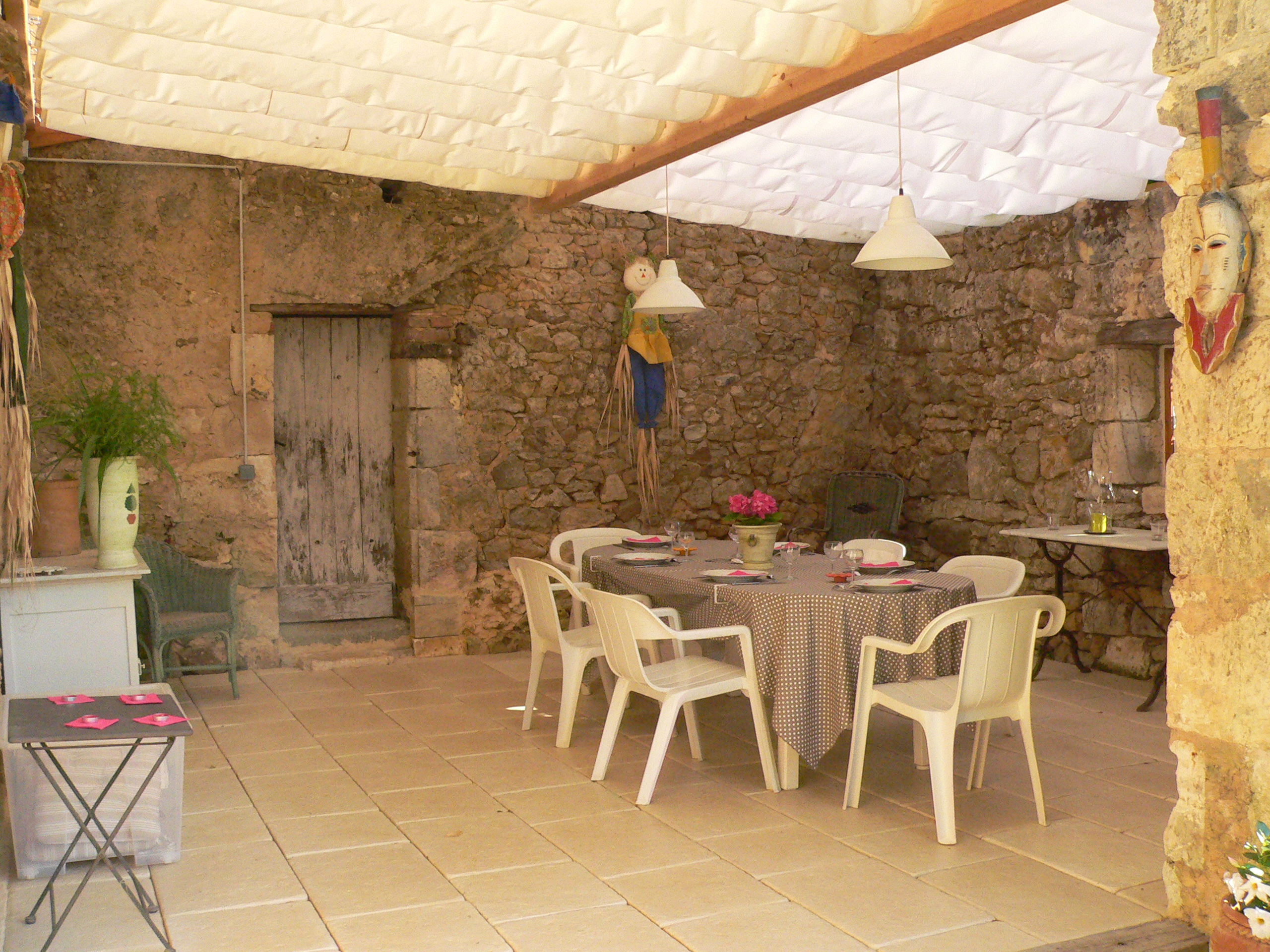 A proximité de la piscine, auvent de 25 m² avec un plafond « vellum », équipé d’un salon de jardin (10 places assises).